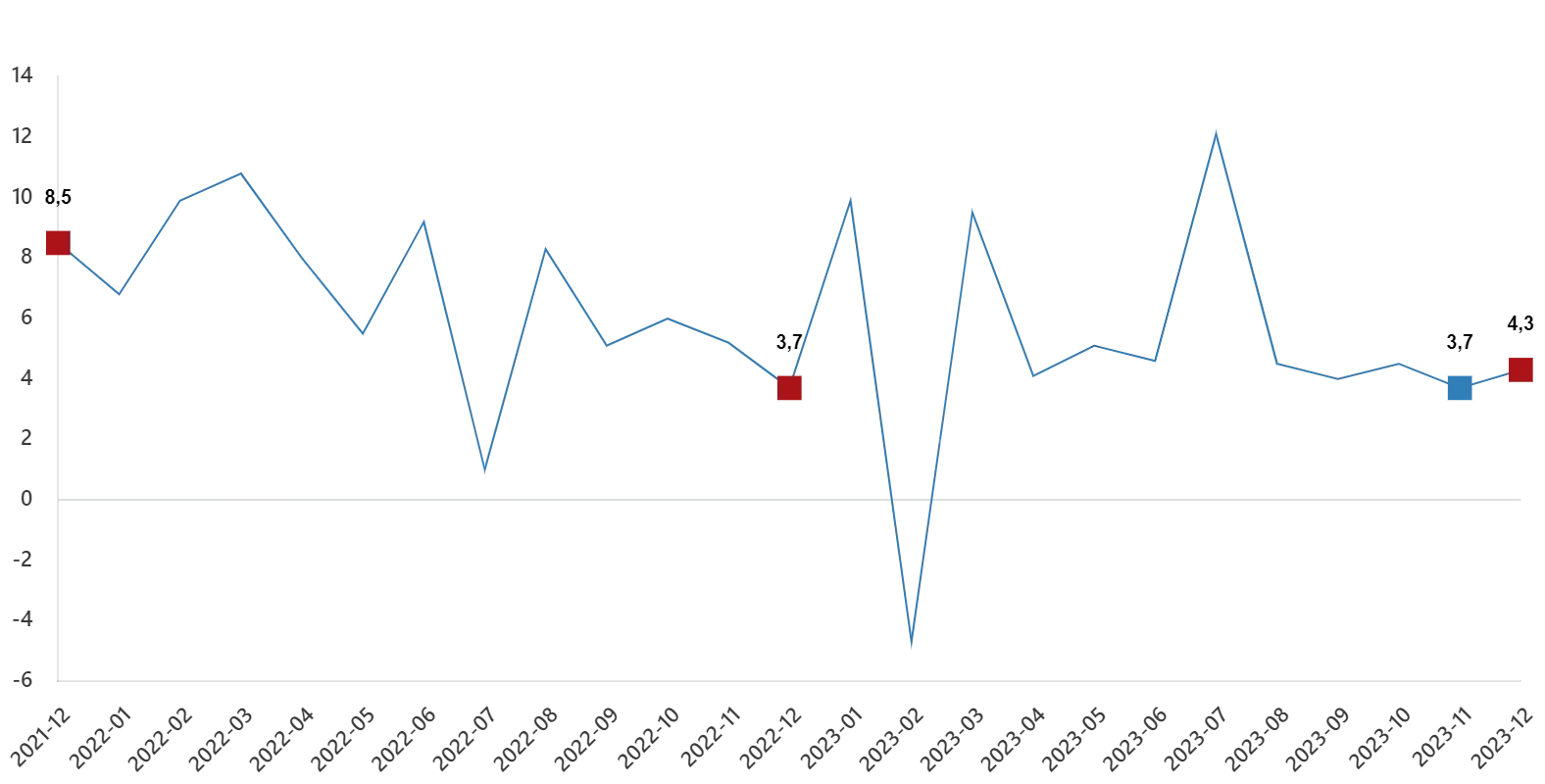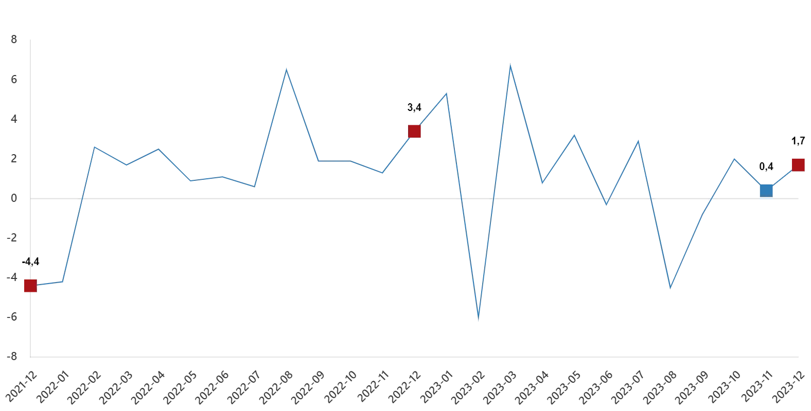 Perakende satış hacmi aylık değişim oranı(%), Aralık 2023