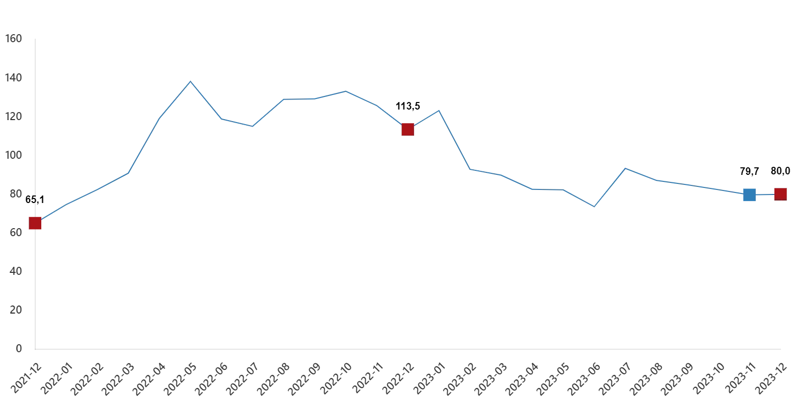 Cari fiyatlarla perakende ciro (2015=100) 2023 yılı Aralık ayında bir önceki yılın aynı ayına göre %80,0 arttı. Aynı ayda gıda, içecek ve tütün satışları %78,8 arttı, gıda dışı satışlar (otomotiv yakıtı hariç) %85,1 arttı, otomotiv yakıtı satışları ise %62,9 arttı.