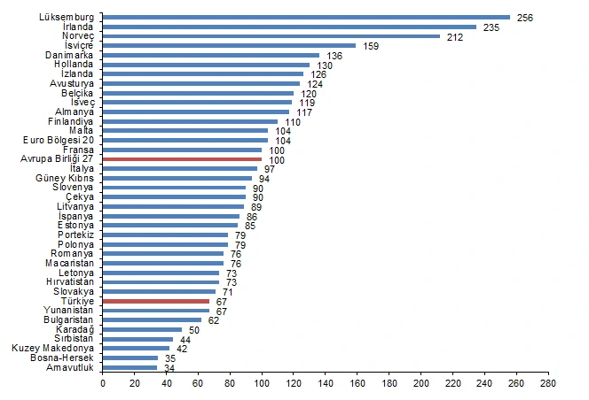 Avrupa Birliği İstatistik Ofisi (Eurostat) tarafından açıklanan SGP’ye göre kişi başına gayrisafi yurt içi hasıla (GSYH) endeksi 2022 yılı sonuçlarına göre 27 Avrupa Birliği (AB) ülkesi ortalaması 100 iken, bu değer Türkiye için 67 oldu ve AB ortalamasının %33 altında kaldı.