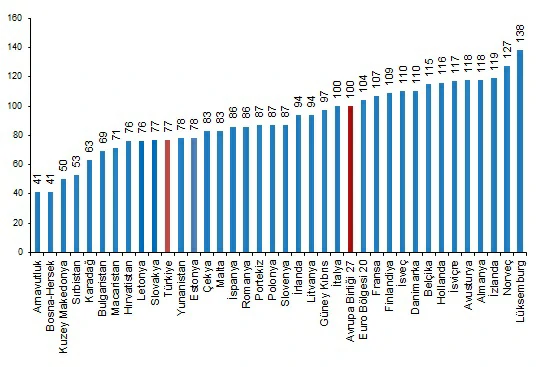 Kişi başına fiili bireysel tüketim düzeyi 27 Avrupa Birliği ülkesi ortalaması 100 iken, Türkiye için 77 oldu ve AB ortalamasının %23 altında kaldı. Karşılaştırmalarda yer alan 36 ülke arasında kişi başına fiili bireysel tüketim değeri en yüksek ülke 138 ile Lüksemburg, en düşük ülkeler ise 41 ile Arnavutluk ve Bosna Hersek oldu.