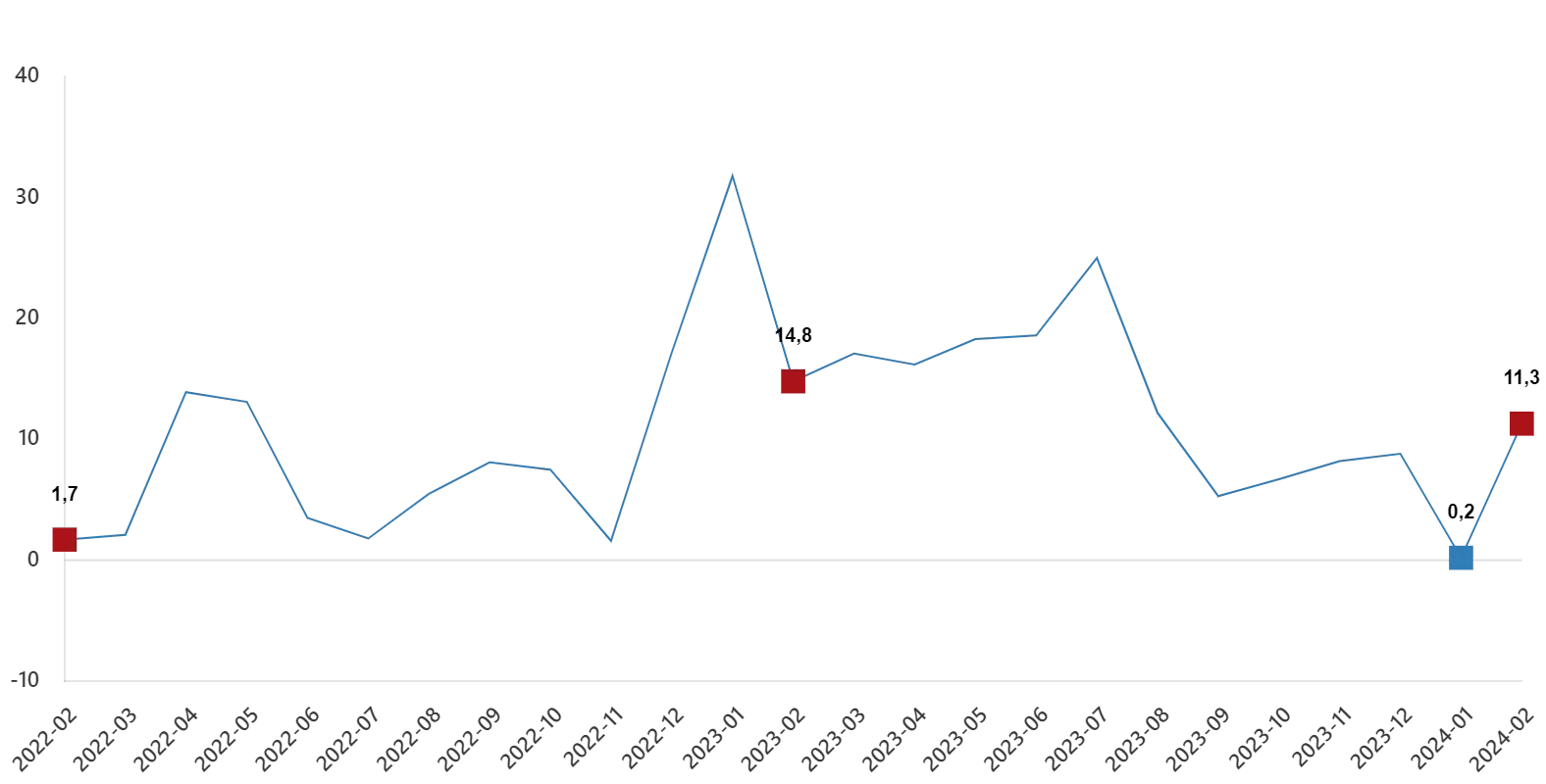 Ticaret satış hacmi aylık değişim oranı (%), Şubat 2024
