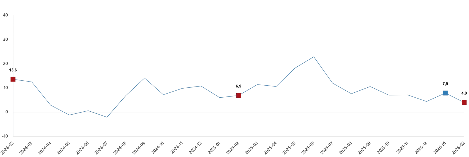 Ticaret satış hacmi (2021=100) 2026 yılı Şubat ayında bir önceki yılın aynı ayına göre %4,0 arttı. Aynı ayda motorlu kara taşıtlarının ve motosikletlerin toptan ve perakende ticareti ile onarımı için satış hacmi %1,5 azaldı, toptan ticaret satış hacmi %0,1 azaldı, perakende ticaret satış hacmi ise %15,6 arttı.