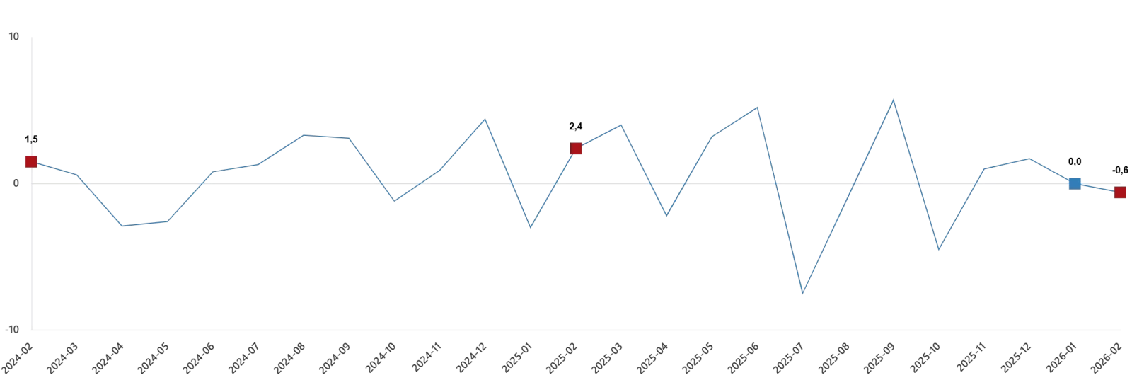 Ticaret satış hacmi (2021=100) 2026 yılı Şubat ayında bir önceki aya göre %0,6 azaldı. Aynı ayda motorlu kara taşıtlarının ve motosikletlerin toptan ve perakende ticareti ile onarımı için satış hacmi %5,5 azaldı, toptan ticaret satış hacmi %0,2 arttı, perakende ticaret satış hacmi ise %0,2 azaldı.