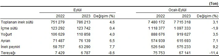 Eylül ayında bir önceki yılın aynı ayına göre, inek peyniri üretimi %7,7, ayran üretimi %6,5, yoğurt üretimi %4,0 ve içme sütü üretimi %0,4 artarken; tereyağı üretimi %8,6 azaldı. Ocak-Eylül döneminde ise bir önceki yılın aynı dönemine göre, inek peyniri üretimi %9,2, ayran üretimi %7,1 ve yoğurt üretimi %3,5 artarken; tereyağı üretimi %11,4 ve içme sütü üretimi %1,9 azaldı.