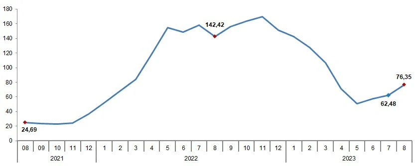 Tarım-ÜFE yıllık değişim oranı (%), Ağustos 2023