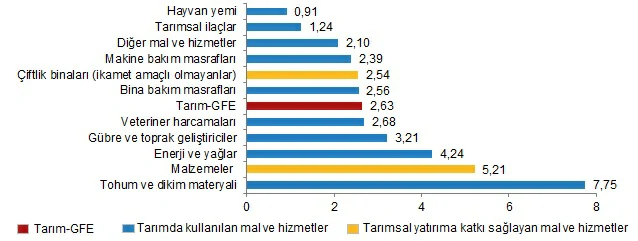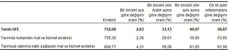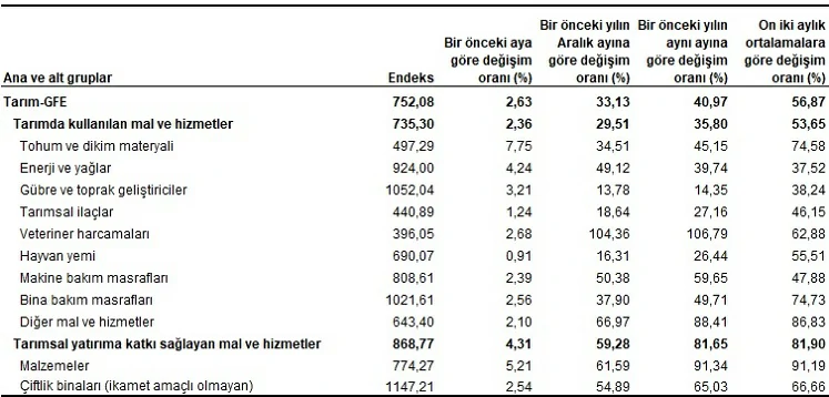 Ana gruplarda bir önceki aya göre, tarımda kullanılan mal ve hizmet endeksinde %2,36, tarımsal yatırıma katkı sağlayan mal ve hizmet endeksinde %4,31 artış gerçekleşti. Bir önceki yılın aynı ayına göre göre tarımda kullanılan mal ve hizmet endeksinde %35,80, tarımsal yatırıma katkı sağlayan mal ve hizmet endeksinde %81,65 artış gerçekleşti.