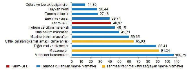 Bir önceki yılın aynı ayına göre artışın düşük olduğu alt gruplar %14,35 ile gübre ve toprak geliştiriciler ve %26,44 ile hayvan yemi oldu. Yıllık artışın yüksek olduğu alt gruplar ise sırasıyla, %106,79 ile veteriner harcamaları ve %91,34 ile malzemeler oldu.