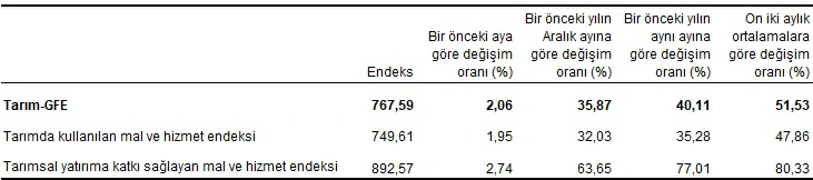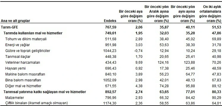 Ana gruplarda bir önceki aya göre, tarımda kullanılan mal ve hizmet endeksinde %1,95, tarımsal yatırıma katkı sağlayan mal ve hizmet endeksinde %2,74 artış gerçekleşti. Bir önceki yılın aynı ayına göre göre tarımda kullanılan mal ve hizmet endeksinde %35,28, tarımsal yatırıma katkı sağlayan mal ve hizmet endeksinde %77,01 artış gerçekleşti.