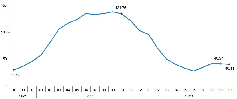 Tarım-GFE’de (2015=100), 2023 yılı Ekim ayında bir önceki aya göre %2,06, bir önceki yılın Aralık ayına göre %35,87, bir önceki yılın aynı ayına göre %40,11 ve on iki aylık ortalamalara göre %51,53 artış gerçekleşti.
