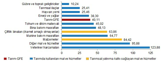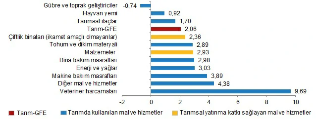 Bir önceki yılın aynı ayına göre artışın düşük olduğu alt gruplar %10,24 ile gübre ve toprak geliştiriciler ve %25,41 ile tarımsal ilaçlar oldu. Yıllık artışın yüksek olduğu alt gruplar ise sırasıyla, %123,88 ile veteriner harcamaları ve %95,88 ile diğer mal ve hizmetler oldu.