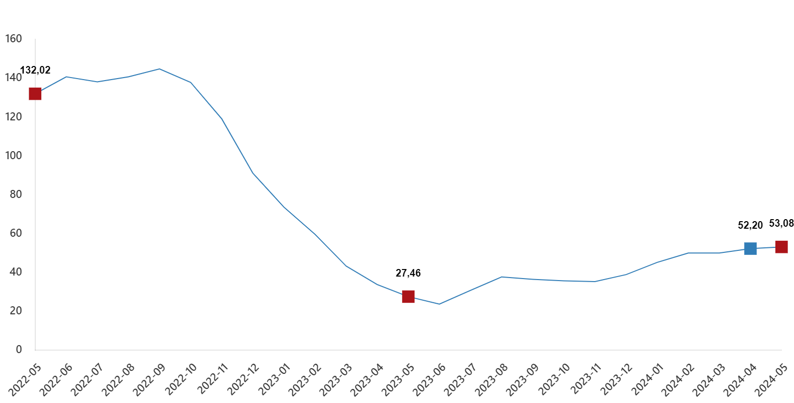 Tarım-GFE’de (2020=100), 2024 yılı Mayıs ayında bir önceki aya göre %0,85 artış, bir önceki yılın Aralık ayına göre %15,58 artış, bir önceki yılın aynı ayına göre %53,08 artış ve on iki aylık ortalamalara göre %41,12 artış gerçekleşti.
