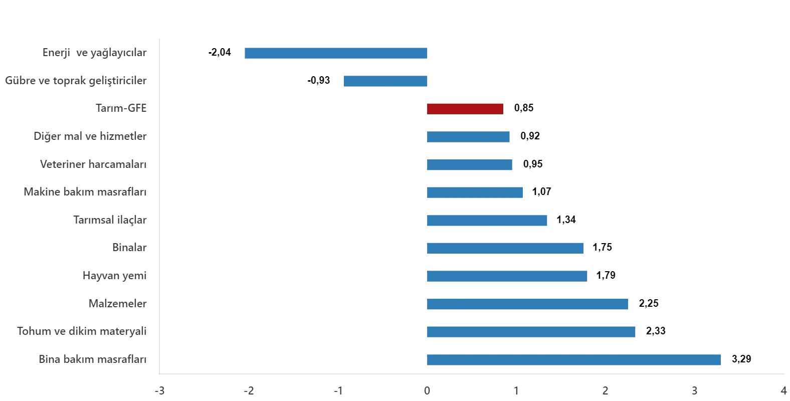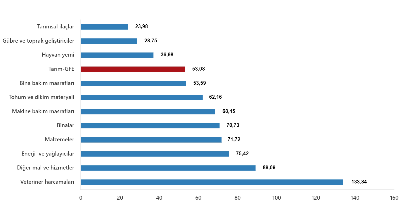 Ana gruplarda bir önceki aya göre, tarımda kullanılan mal ve hizmetler endeksinde %0,63 artış, tarımsal yatırıma katkı sağlayan mal ve hizmetler endeksinde %2,18 artış gerçekleşti. Bir önceki yılın aynı ayına göre tarımda kullanılan mal ve hizmetler endeksinde %50,35 artış, tarımsal yatırıma katkı sağlayan mal ve hizmetler endeksinde %71,59 artış gerçekleşti.