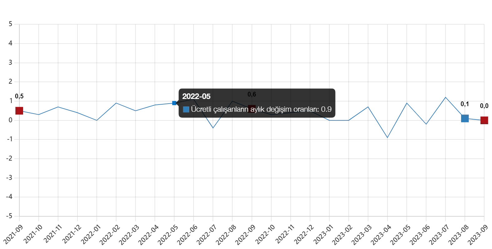 Ücretli çalışanların alt detaylarına bakıldığında; 2023 Eylül ayında ücretli çalışanlar aylık olarak sanayi sektöründe %0,4 azaldı, inşaat sektöründe %0,5 arttı ve ticaret-hizmet sektöründe %0,1 arttı.
