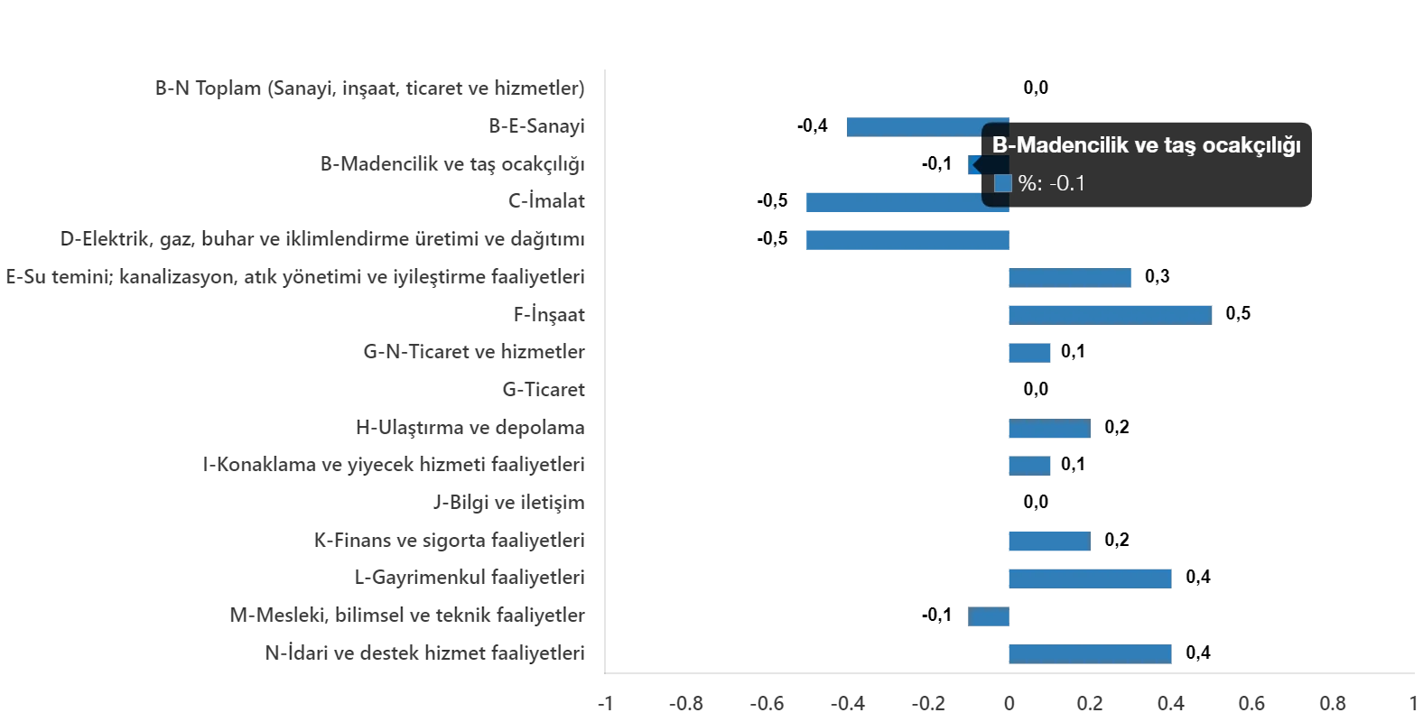 | B-Madencilik ve taş ocakçılığı | 146 368 | 147 582 | -1 214 | -0,8 |