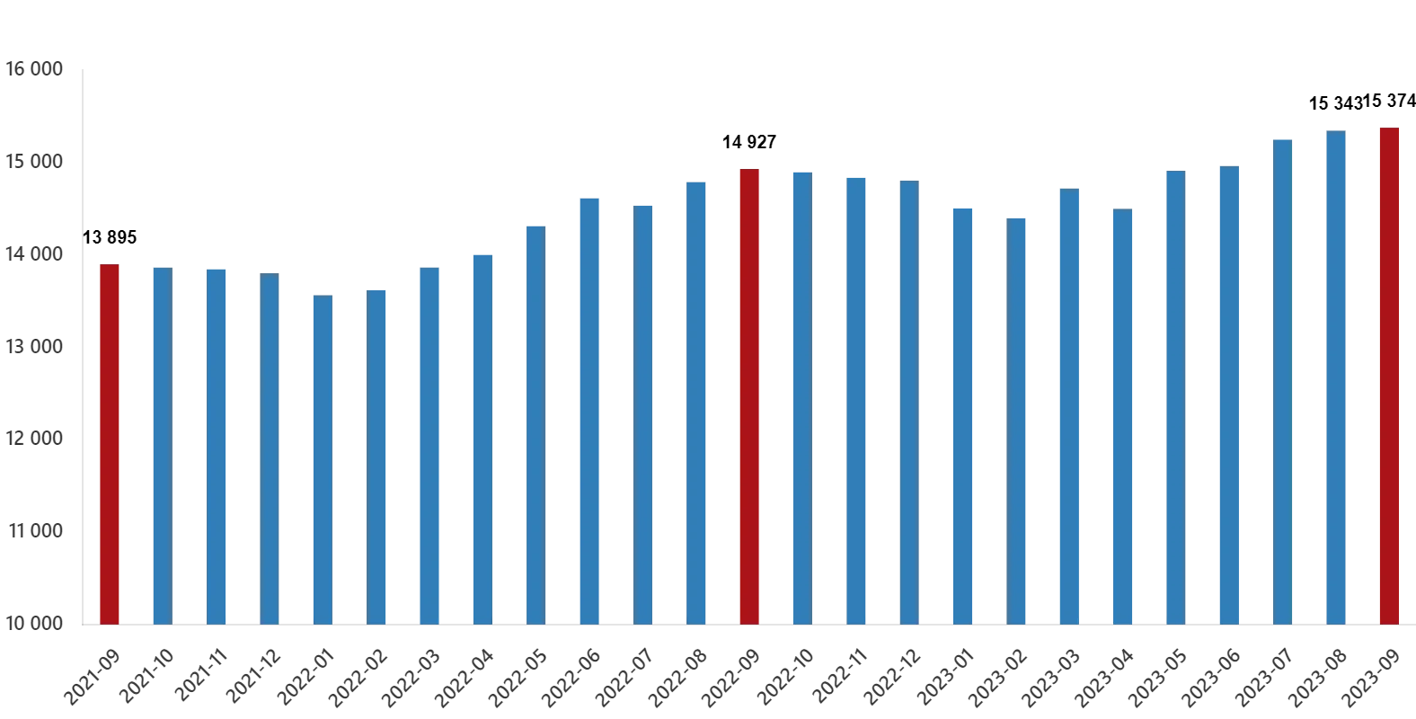 Sanayi, inşaat ve ticaret-hizmet sektörleri toplamında ücretli çalışan sayısı 2023 Eylül ayında bir önceki yılın aynı ayına göre %3,0 arttı. Ücretli çalışan sayısı bir önceki yılın aynı ayında 14 milyon 926 bin 919 kişi iken, 2023 yılı Eylül ayında 15 milyon 374 bin 379 kişi oldu.