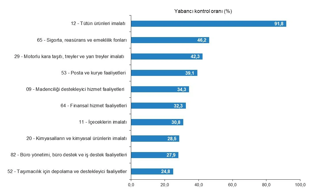 Tütün ürünleri imalatı 2021 yılında yabancı kontrollü girişimlerin ciro payının %91,8 ile en yüksek olduğu faaliyet oldu. Yabancı kontrollü girişimlerin ciro payının en yüksek olduğu ikinci faaliyet ise %46,2 ile sigorta, reasürans ve emeklilik fonları oldu.