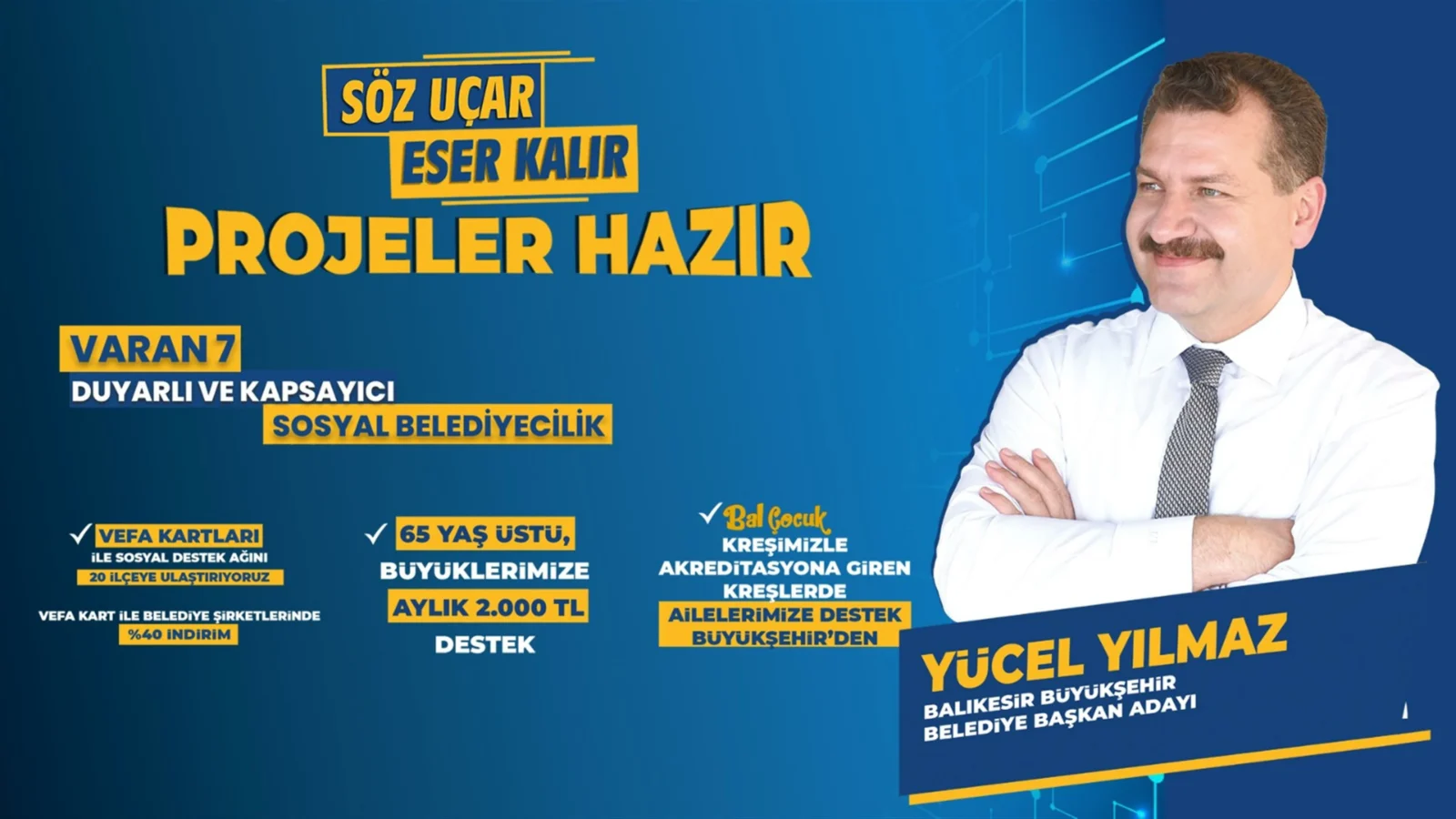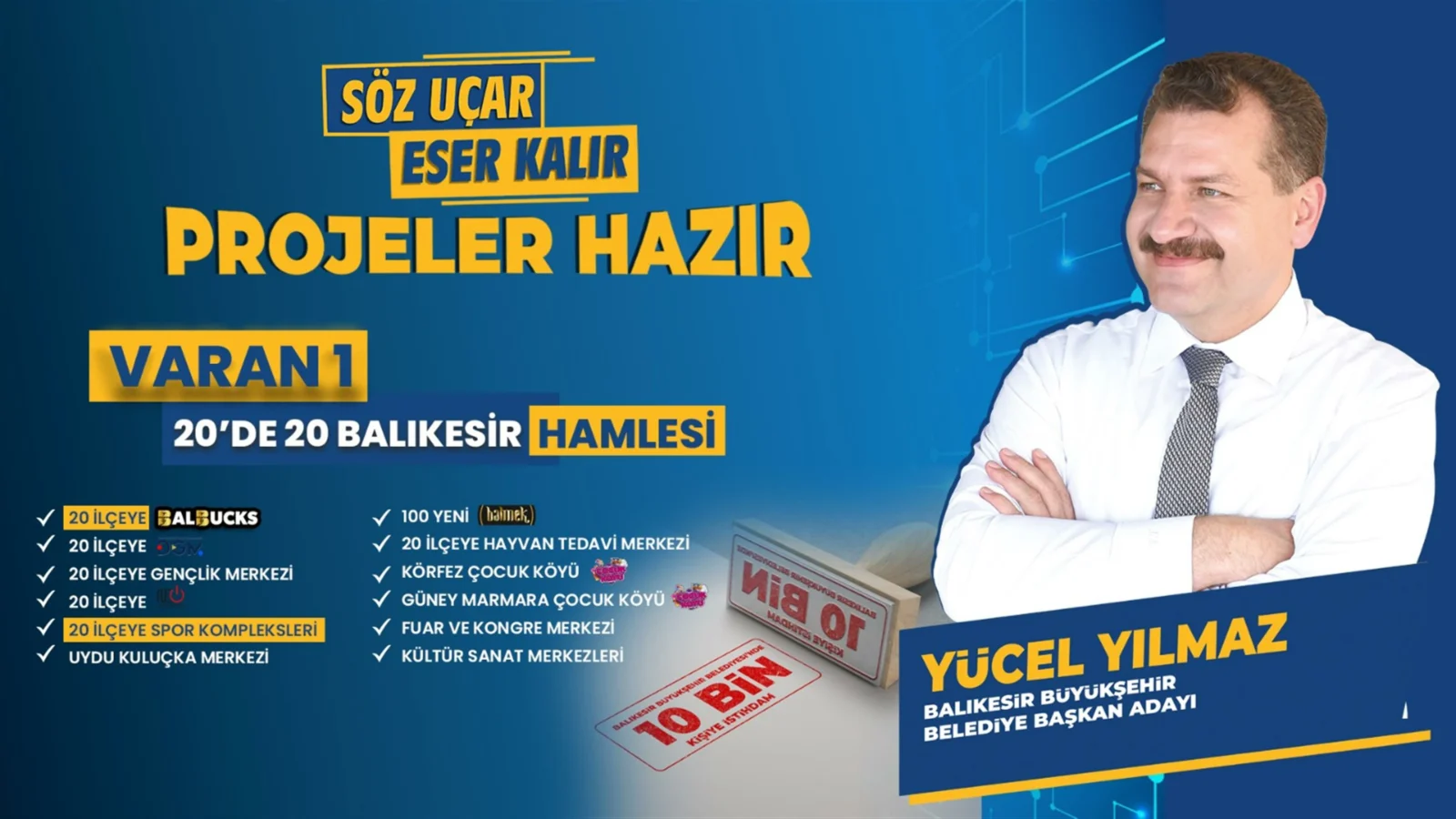 Konuşmasının ardından projelerini sıralayan Başkan Yücel Yılmaz, ilk olarak Varan 1 başlığı altında “20’de 20 Balıkesir Hamlesi”ni anlattı. 20 ilçenin tamamına; BALBUCKS, Dijital Gençlik Merkezi, gençlik merkezi, NE10, spor kompleksi, Uydu Kuluçka Merkezi ve Sokak Hayvanları Tedavi Merkezi kuracaklarını ifade eden Başkan Yılmaz ayrıca hobilerin ticarete dönüşmesine olanak sağlayacak 100 yeni BALMEK açacaklarını söyledi. Körfez ve Güney Marmara bölgelerinde de birer Çocuk Köyü oluşturacaklarını belirten Başkan Yılmaz; Ayşebacı Mahallesi yakınında bir Fuar ve Kongre Merkezi ve şehrin farklı bir noktasında da Kültür ve Sanat Merkezleri oluşturacaklarını ifade etti.