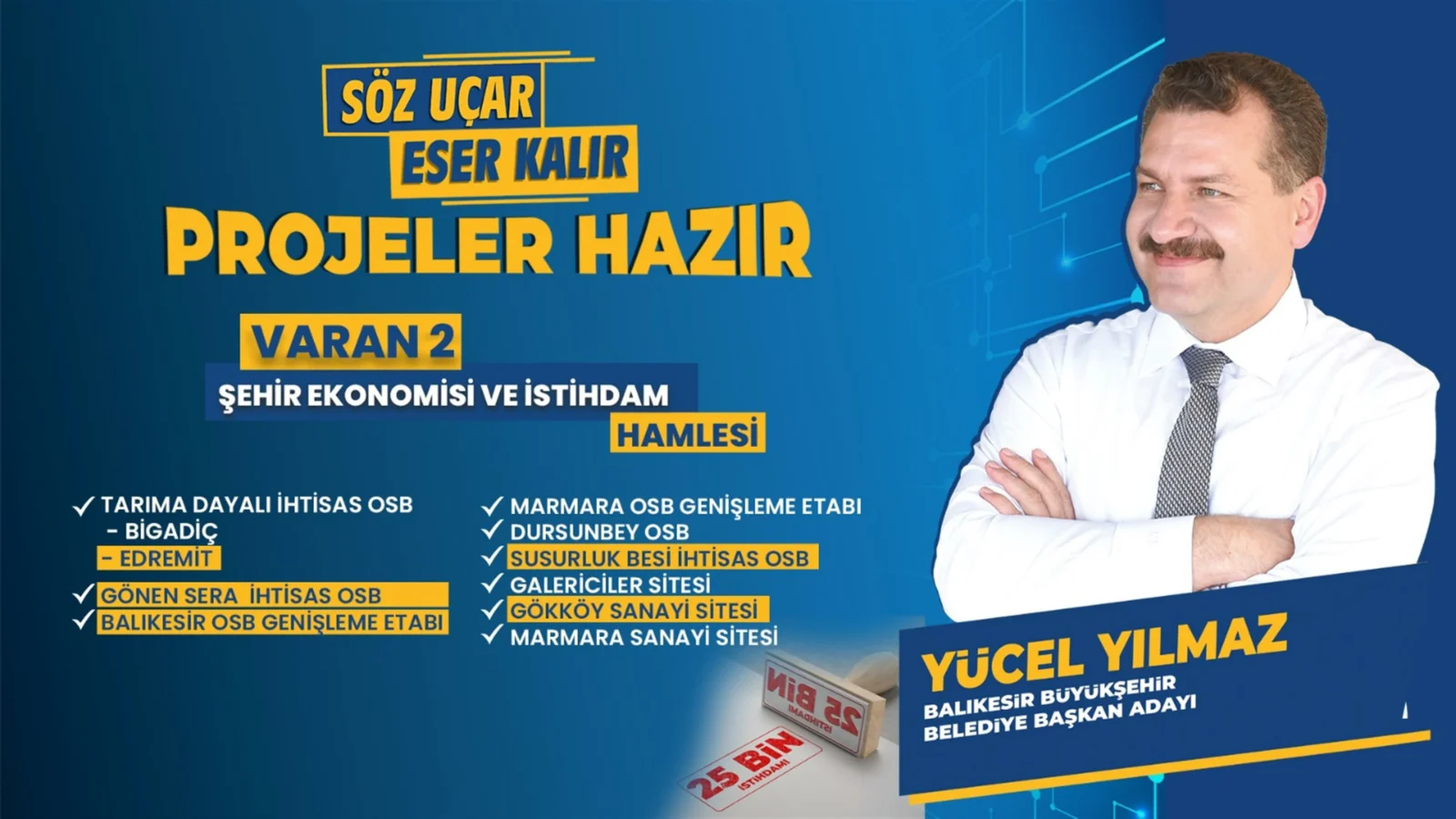 “Şehir Ekonomisi ve İstihdam” projelerini sıraladığı Varan 2 başlığında da Balıkesir’in çocuklarının, Balıkesir’de doyacakları birçok Organize Sanayi Bölgesi ve sanayi siteleri kurulacağını müjdeledi. Bigadiç ve Edremit’te Tarıma Dayalı İhtisas OSB, Gönen Sera İhtisas OSB, Balıkesir OSB Genişleme Etabı, Marmara OSB Genişleme Etabı, Dursunbey OSB, Susurluk Besi İhtisas OSB’leri, Bakanlıkla beraber yapacaklarını söyleyen Yücel Yılmaz, arsa tahsis sözleşmelerini teslim edeceklerini söyledi. Galericiler Sitesi, Gökköy Sanayi Sitesi ve Marmara Sanayi Sitesi ile birlikte toplamda 25 bin kişiye istihdam sağlanacak.