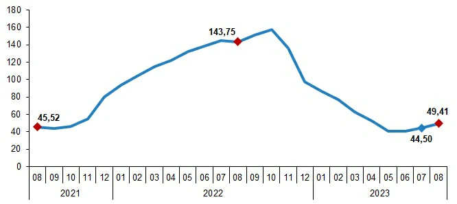Yİ-ÜFE (2003=100) 2023 yılı Ağustos ayında bir önceki aya göre %5,89, bir önceki yılın Aralık ayına göre %31,59, bir önceki yılın aynı ayına göre %49,41 ve on iki aylık ortalamalara göre %71,97 artış gösterdi.