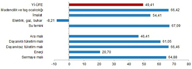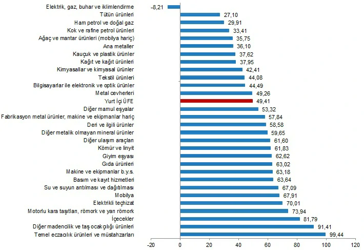 Yıllık azalış gösteren tek alt sektör %8,21 ile elektrik, gaz, buhar ve iklimlendirme oldu. Buna karşılık temel eczacılık ürünleri ve müstahzarları %99,44, diğer madencilik ve taş ocakçılığı ürünleri %91,41, içecekler %81,79 ile endekslerin en fazla arttığı alt sektörler oldu.