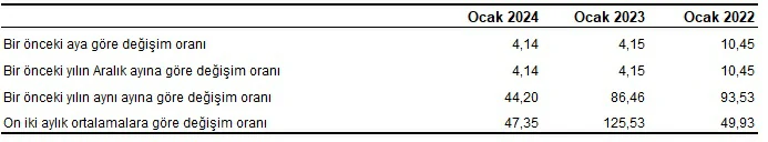 Yİ-ÜFE (2003=100) 2024 yılı Ocak ayında bir önceki aya göre %4,14, bir önceki yılın Aralık ayına göre %4,14, bir önceki yılın aynı ayına göre %44,20 ve on iki aylık ortalamalara göre %47,35 artış gösterdi.