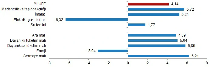 Ana sanayi gruplarının yıllık değişimleri; ara malında %49,76 artış, dayanıklı tüketim malında %56,63 artış, dayanıksız tüketim malında %60,81 artış, enerjide %4,06 azalış ve sermaye malında %64,94 artış olarak gerçekleşti.